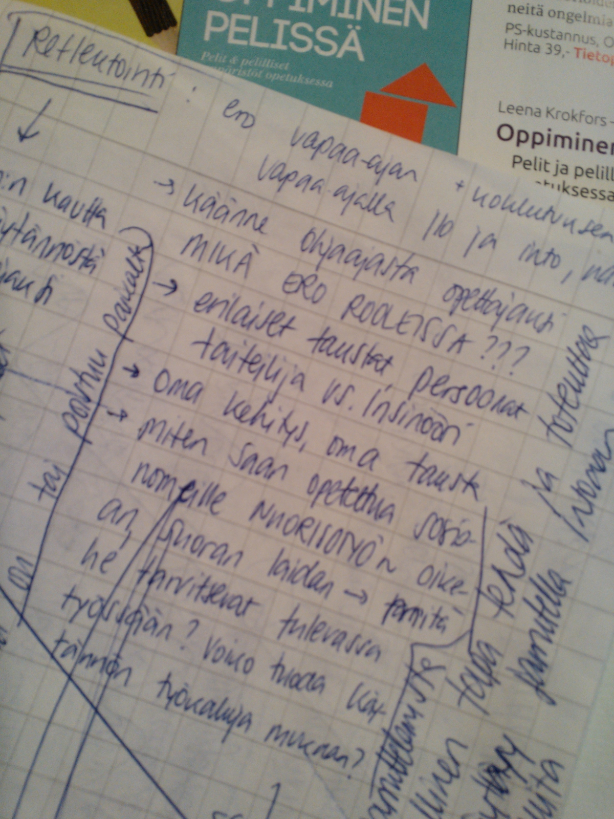 Onpas ollut niin haipakkaa näiden opintojen ja muun elämän suhteen, että nyt vasta ehtii kirjoittamaan oppimispäiväkirjaa puhtaaksi tänne Optimaan. Ohessa kuva muistiinpanoista, joita lähipäivillä paperin reunaan raapustelin siinä toivossa, että jotain asiaakin tänne muistaisin kirjoittaa.