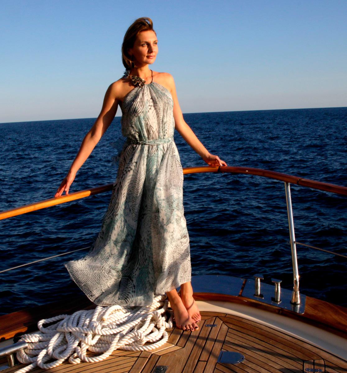 Наполняющие ощущениями нежного морского бриза, струящиеся сарафаны в пол цвета моря – белые, бирюзовые, синие. Женственные платья и летящие длинные юбки идеально подойдут для аперитива и романтического ужина на закате.