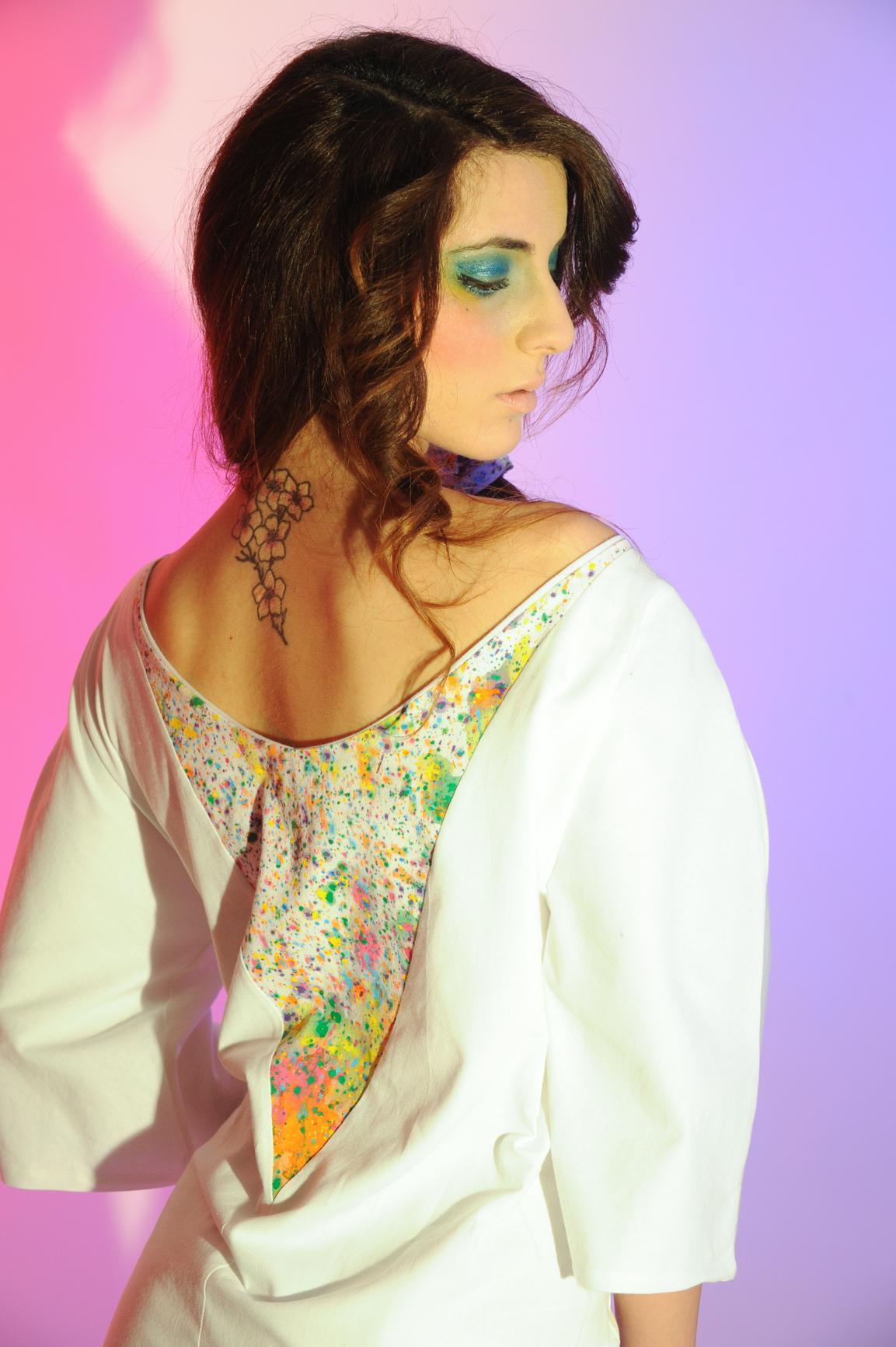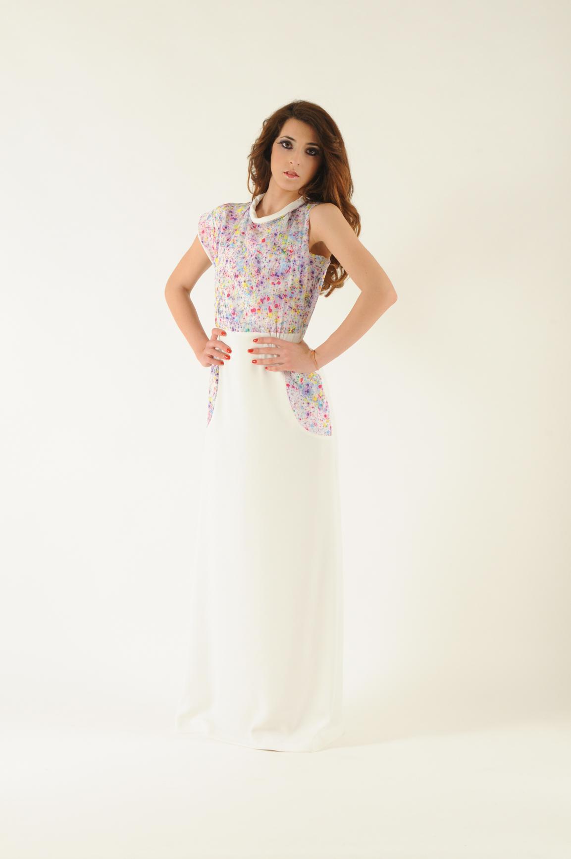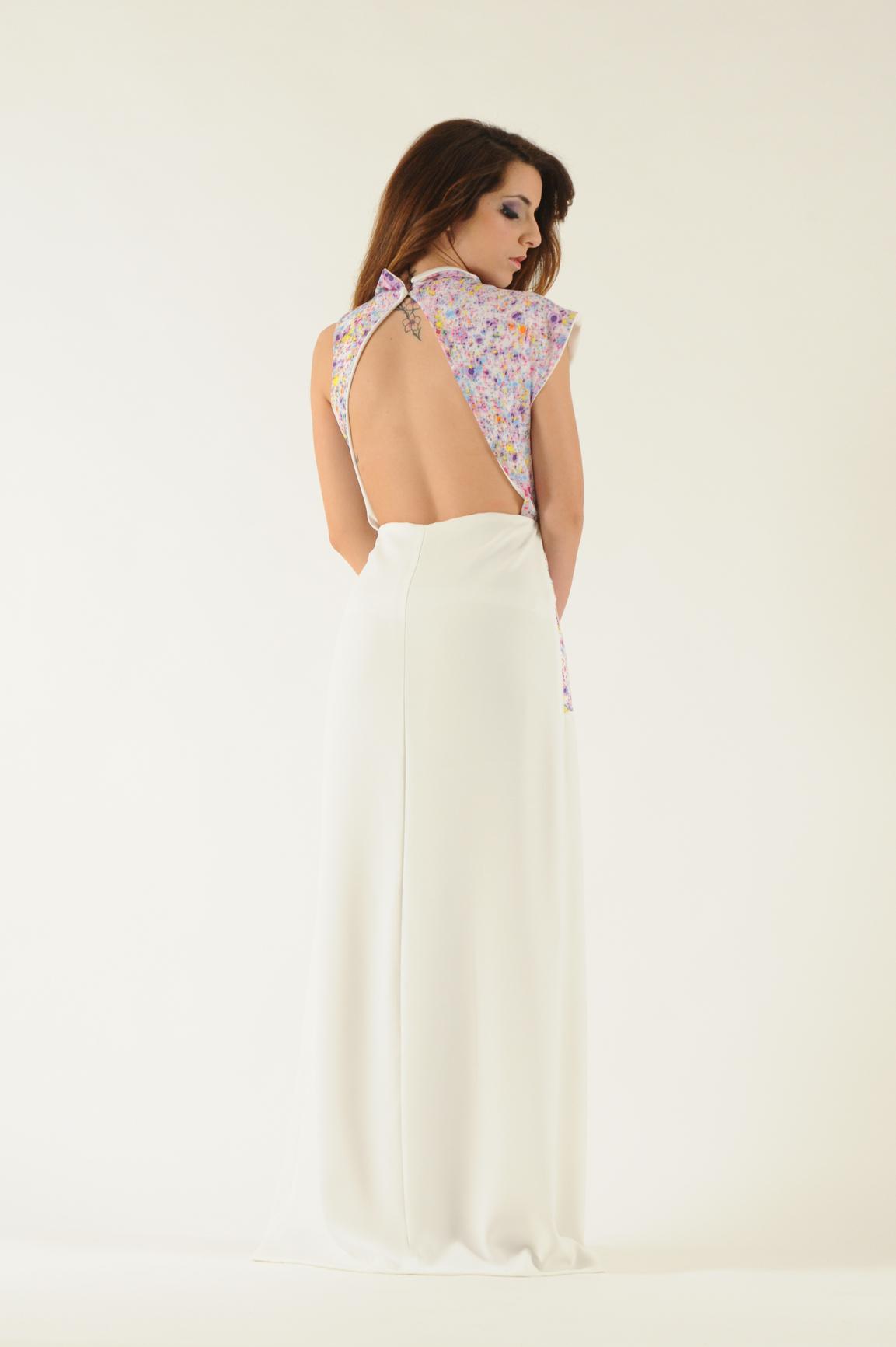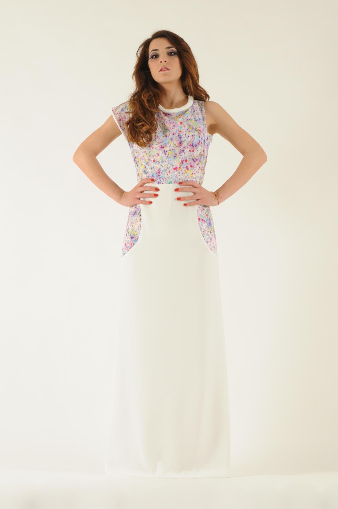 So are the dresses of the collection, white dresses as canvases, painted by the colors of the rainbow, or top, shorts skirts of the same colors. And then evolve into true works of art, long dresses paintings as paintings.