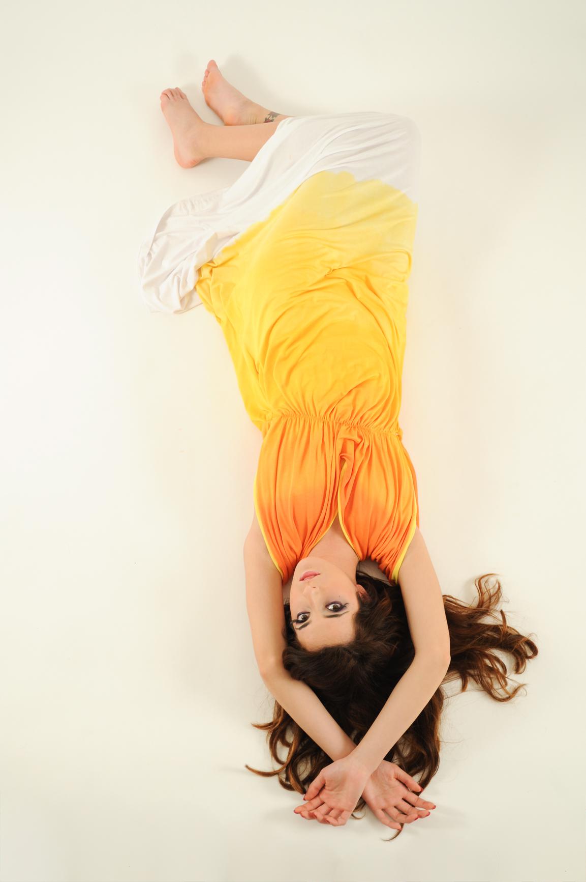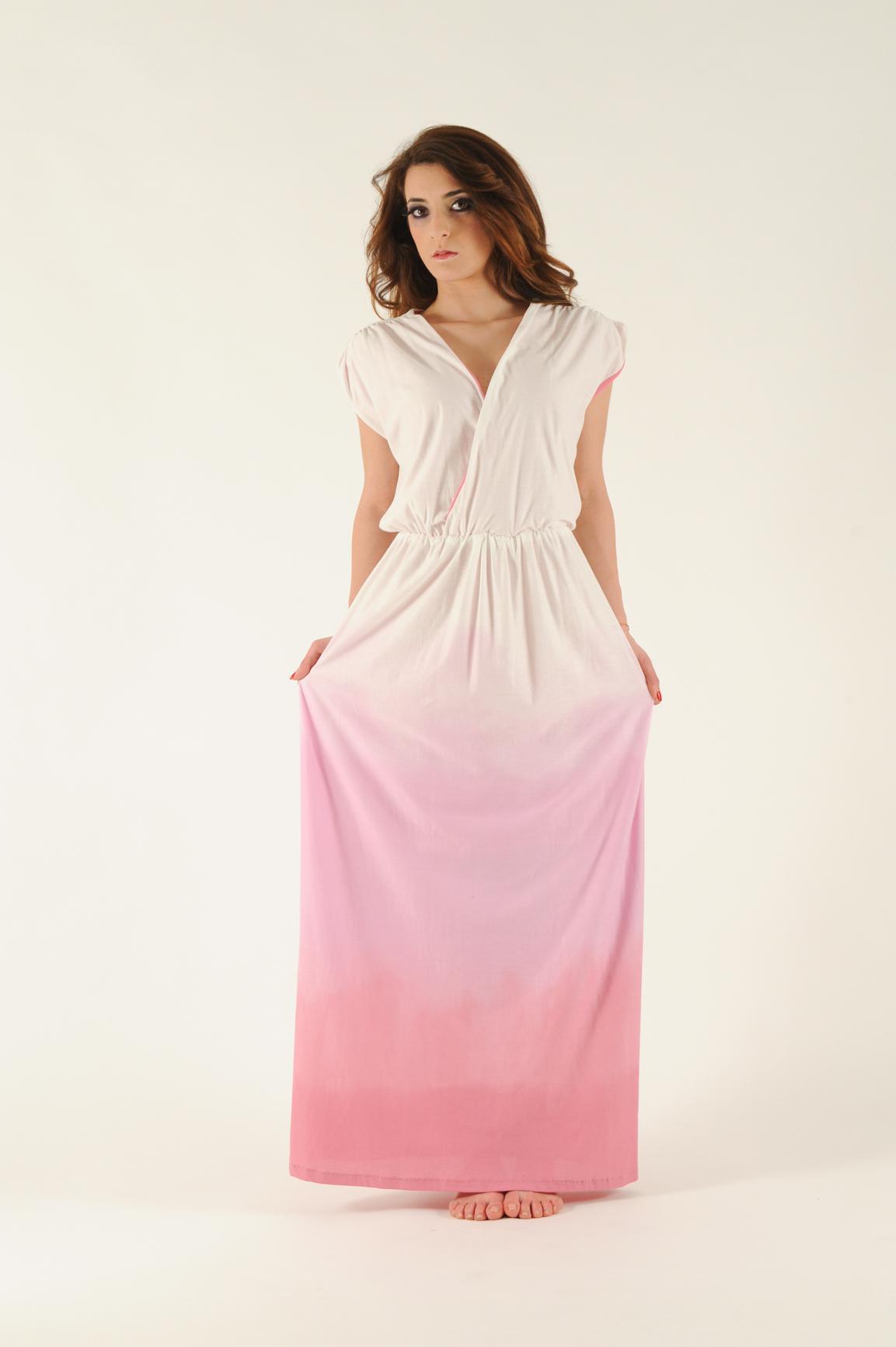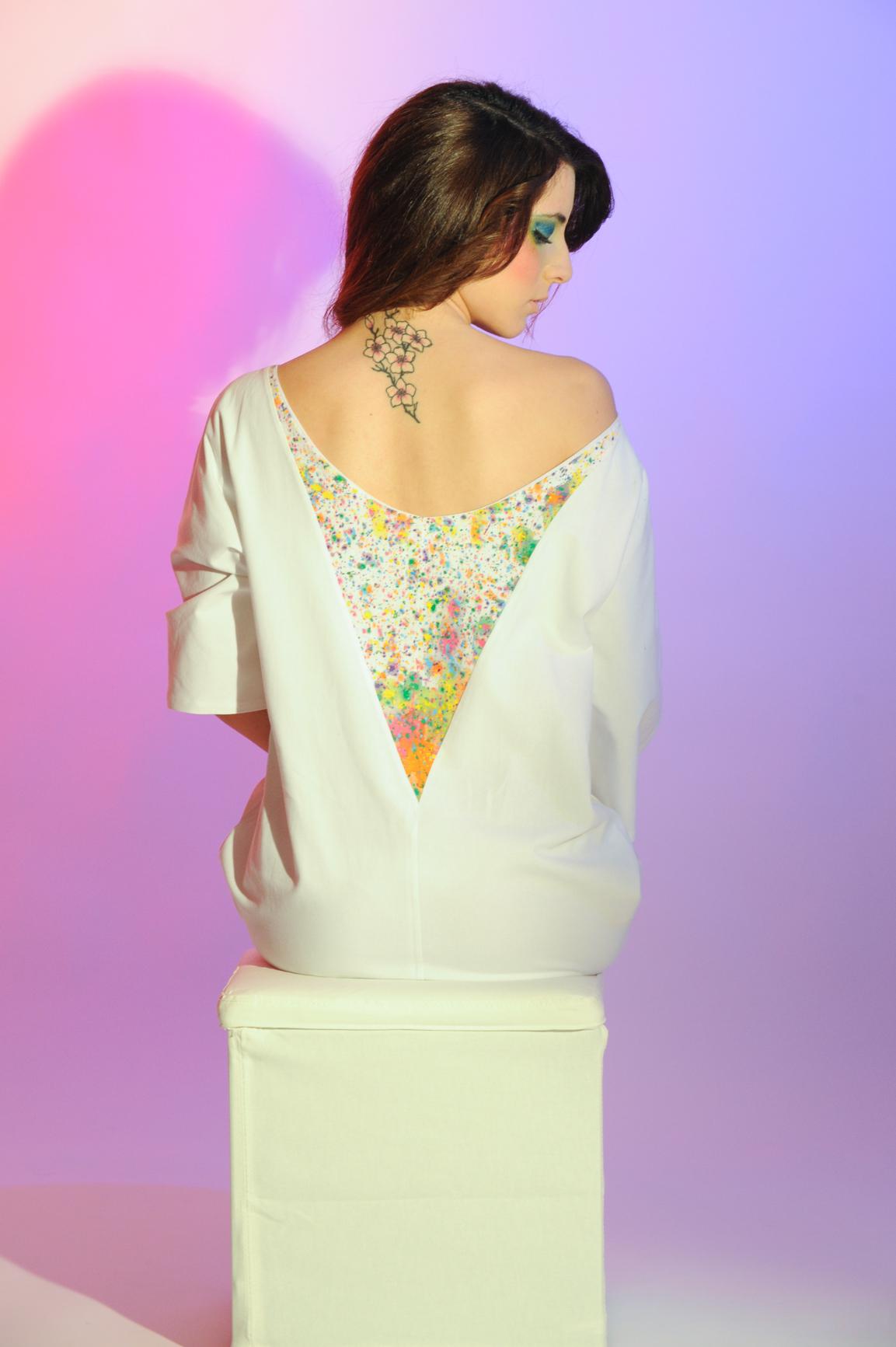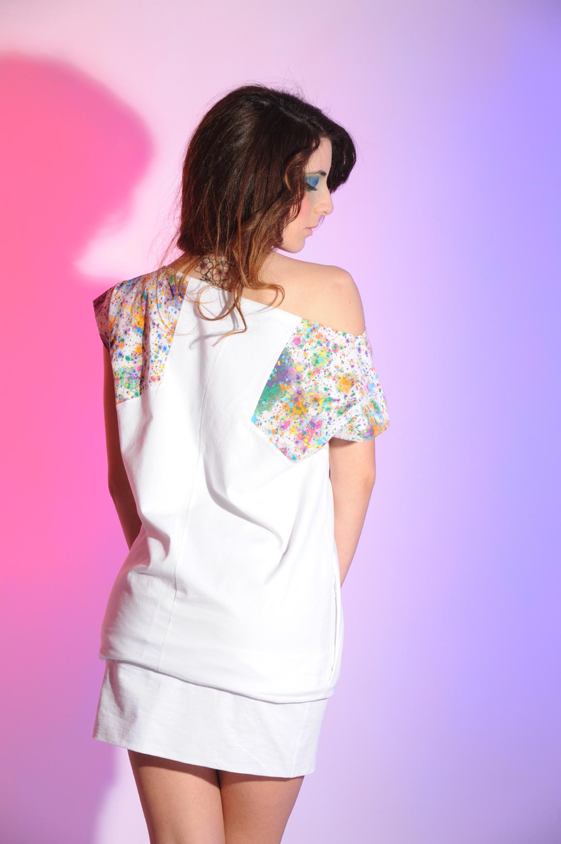 So are the dresses of the collection, white dresses as canvases, painted by the colors of the rainbow, or top, shorts skirts of the same colors. And then evolve into true works of art, long dresses paintings as paintings.
