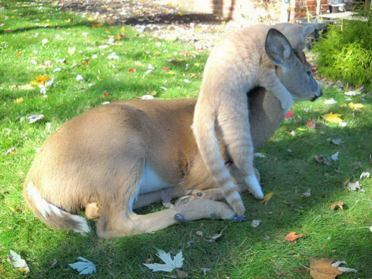 Every Morning, a deer comes to visit a cat.