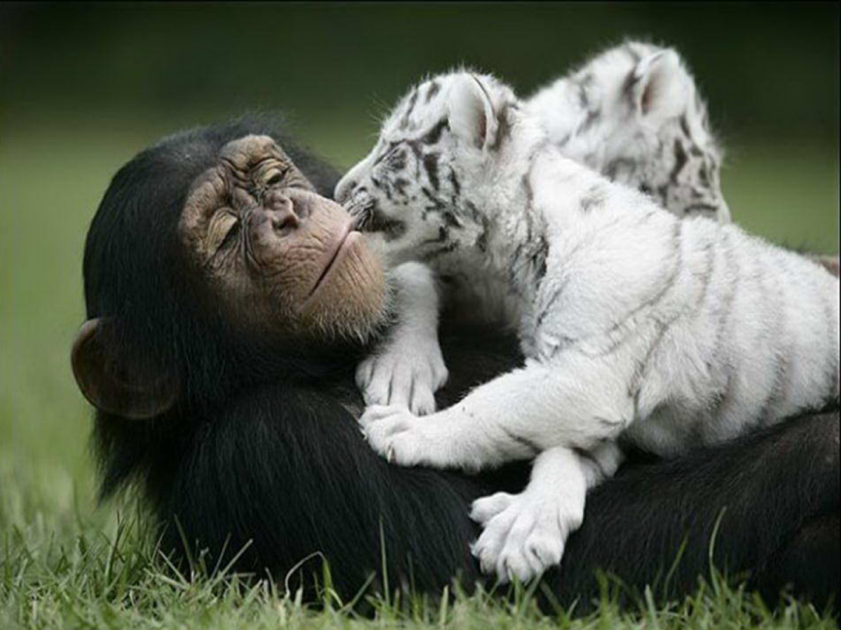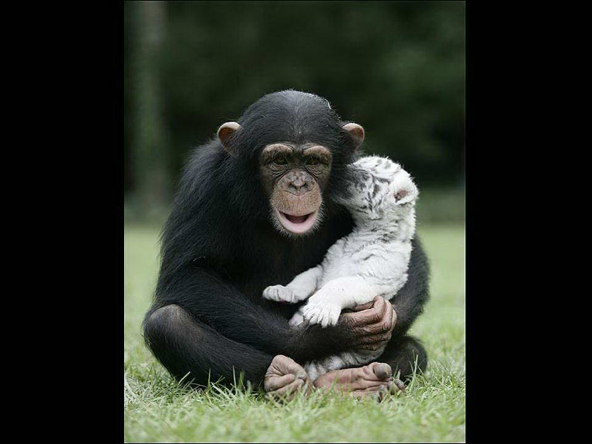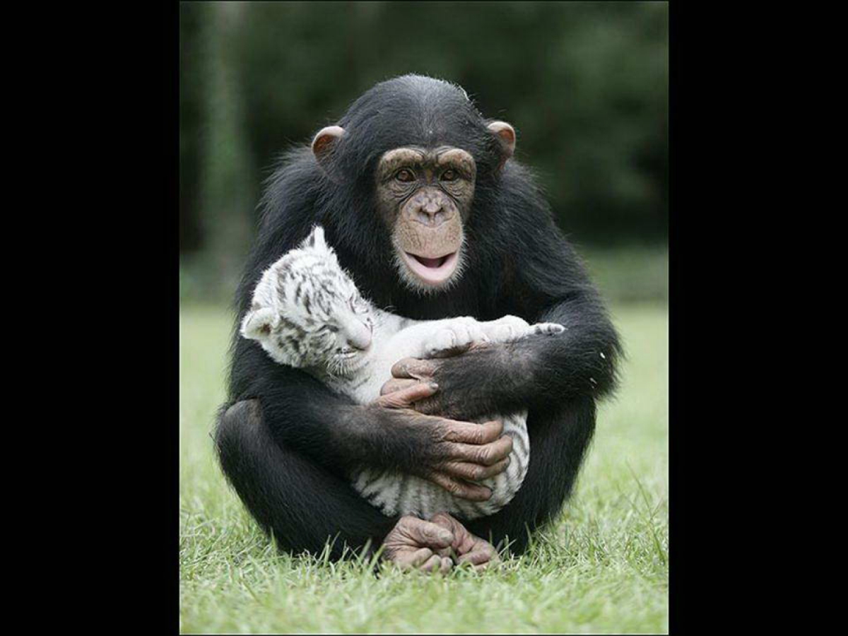 Anjan the chimpanzee saved two white tigers who lost their moms by adopting them. She takes care of the two babies as they were her own kids…you can tell mother instinct has litteraly no borders…