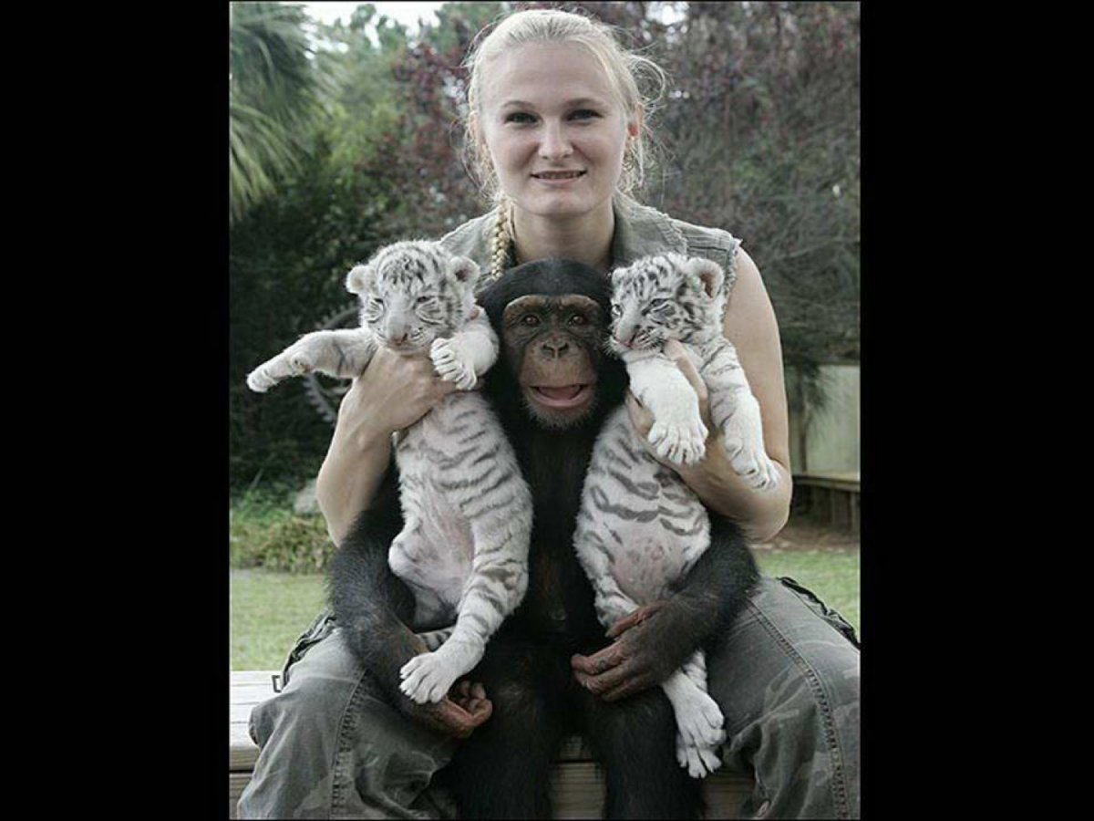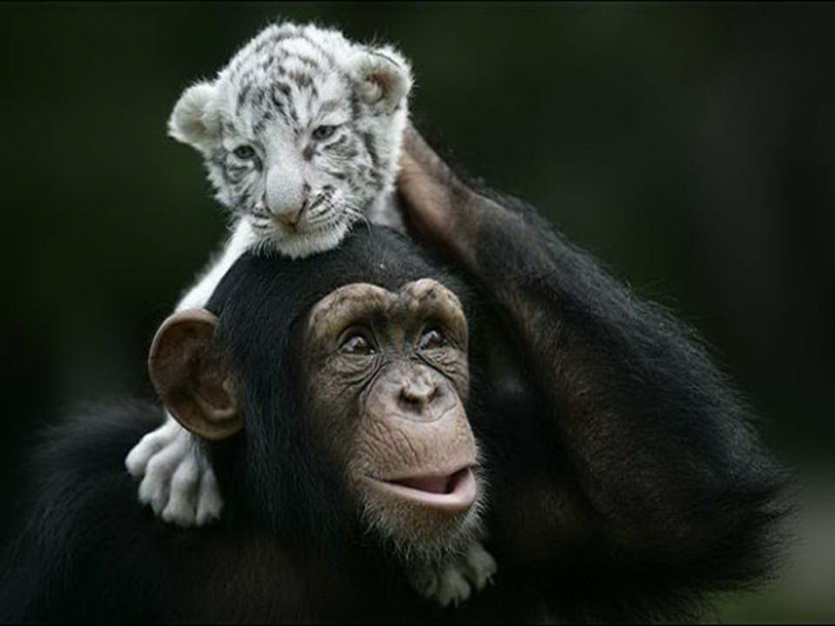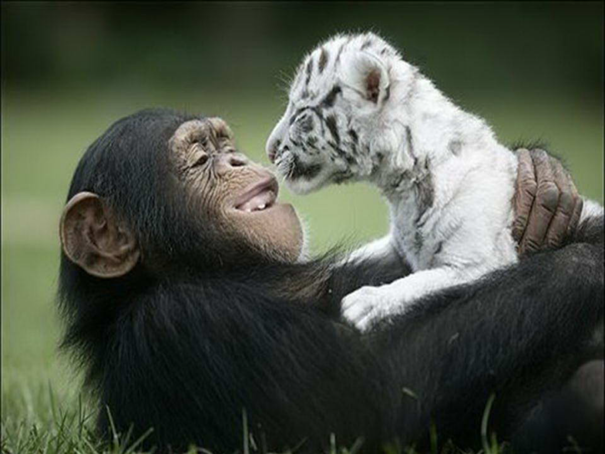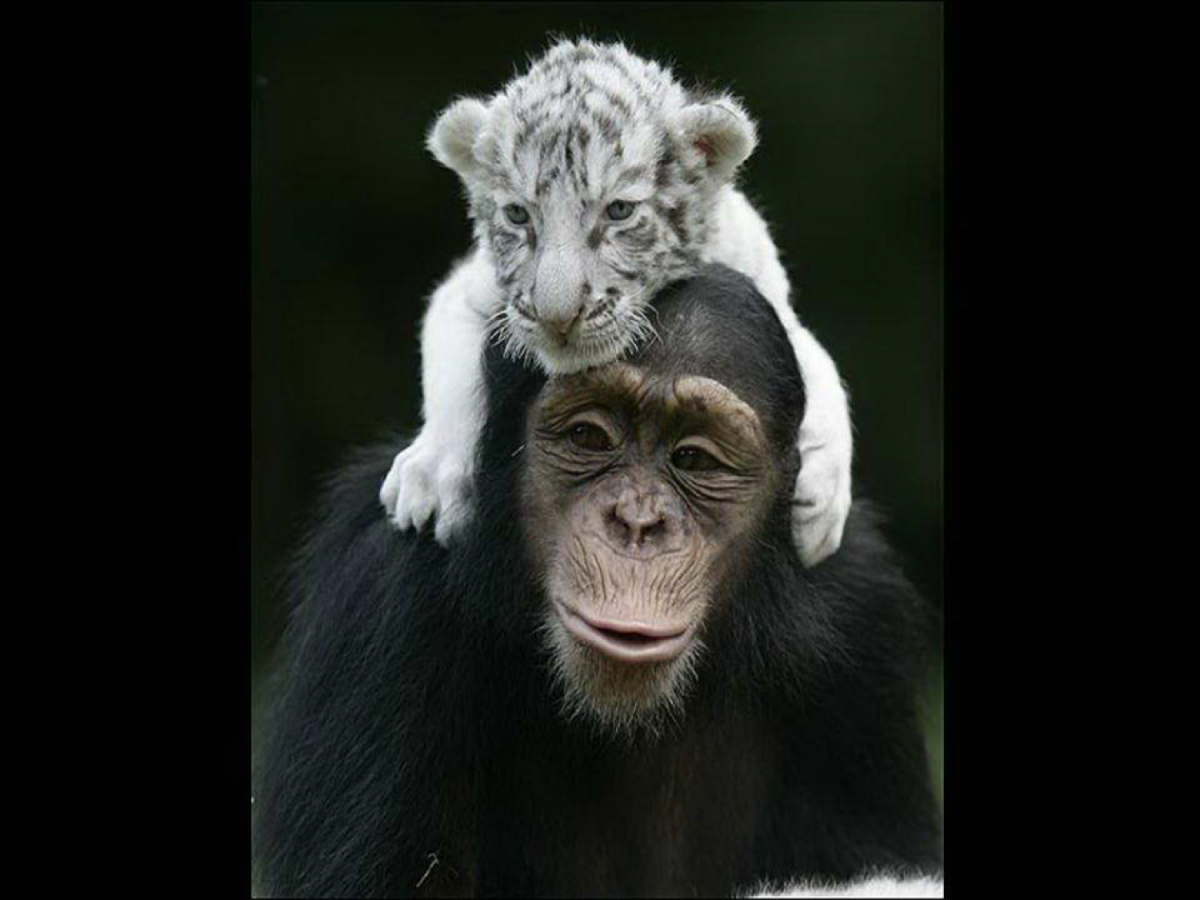 Anjan the chimpanzee saved two white tigers who lost their moms by adopting them. She takes care of the two babies as they were her own kids…you can tell mother instinct has litteraly no borders…