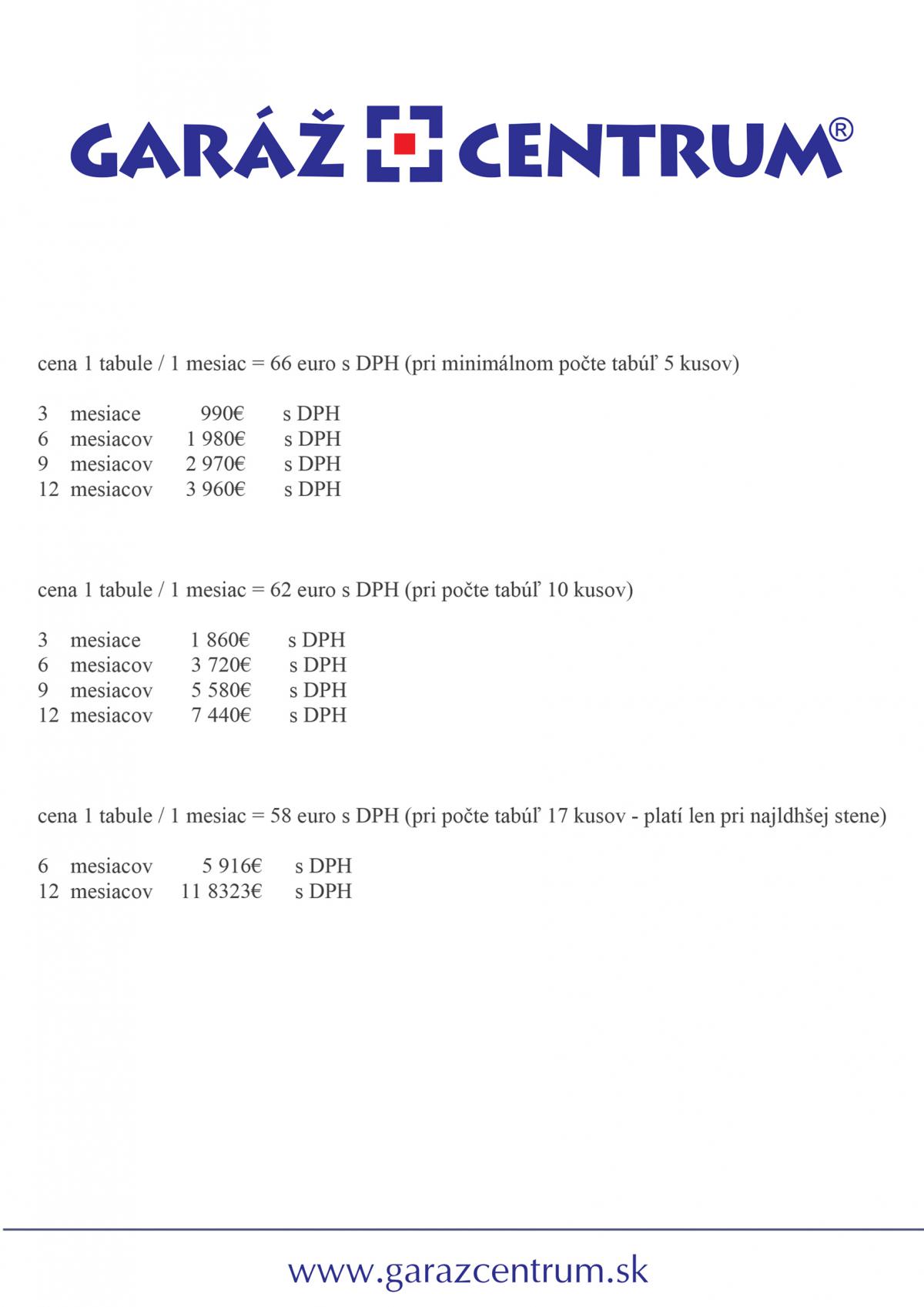 Za účelom overenia si efektívnosti reklamy v našich garážach sme ochotní poskytnúť Vašej spoločnosti možnosť umiestniť Vaše reklamy, resp. reklamy Vašich klientov a experimentovať s ich umiestnením a formátmi v priestoroch garáží na dobu dvoch mesiacov zadarmo.