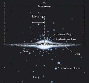 The Milky Way has a halo of dark matter that makes up over 90% of its mass. Yes, 90%. That means that all of what we can see (with the naked eye or telescopes) makes up less than 10% of the mass of the Milky Way. Now, it doesn’t have a halo like those old cartoon characters that die, sprout wings and play a harp in the clouds. The halo is actually invisible, though we know it exists by running simulations of what the Milky Way would look like and how fast stars inside the galaxy’s disk orbit the center. The heavier it is, the faster they should be orbiting. If you assume that the galaxy is made up only of matter that we can see, then you get a rotation rate for the stars that is well below what it should be, so the rest is made up of what is elusively called “dark matter,” or matter that only interacts gravitationally (so far as we know) with “normal matter”.