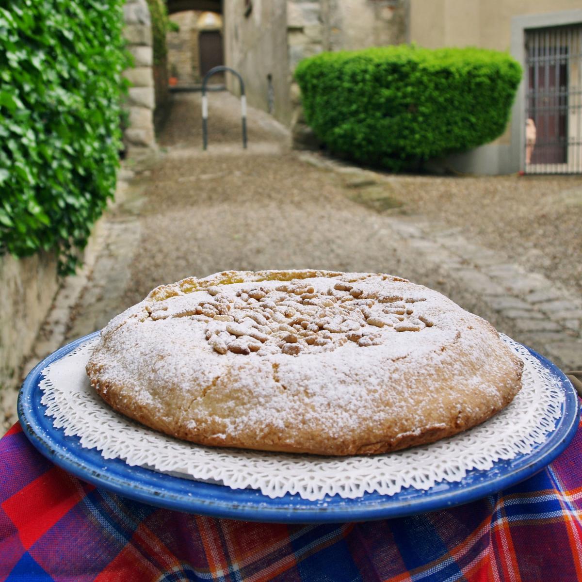 Torta della nonna o Torta con i pinoli. È un dolce di pasta frolla con un ripieno di crema pasticcera, decorato da pinoli (non mandorle!) e zucchero a velo.
