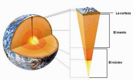 La corteza es la capa mas externa de la tierra tiene un espesor de 10KM,el manto es la capa intermedia de la tierra y tiene un grosor de 2900KM,el núcleo es la capa mas interna de la tierra en ella hay una elevada temperatura.
