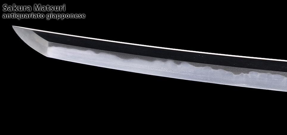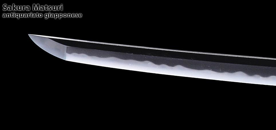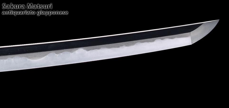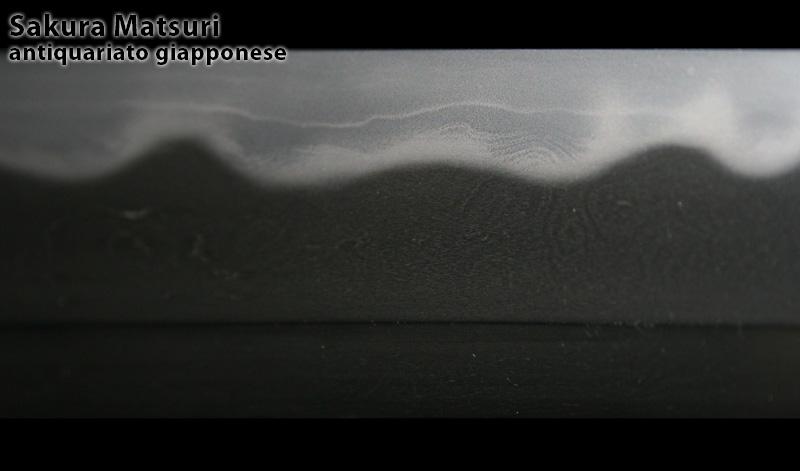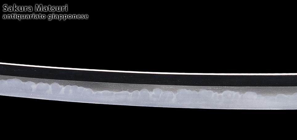 Hada in fine ko itame. Hamon gunome choji midare in notare, con tobi yaki e