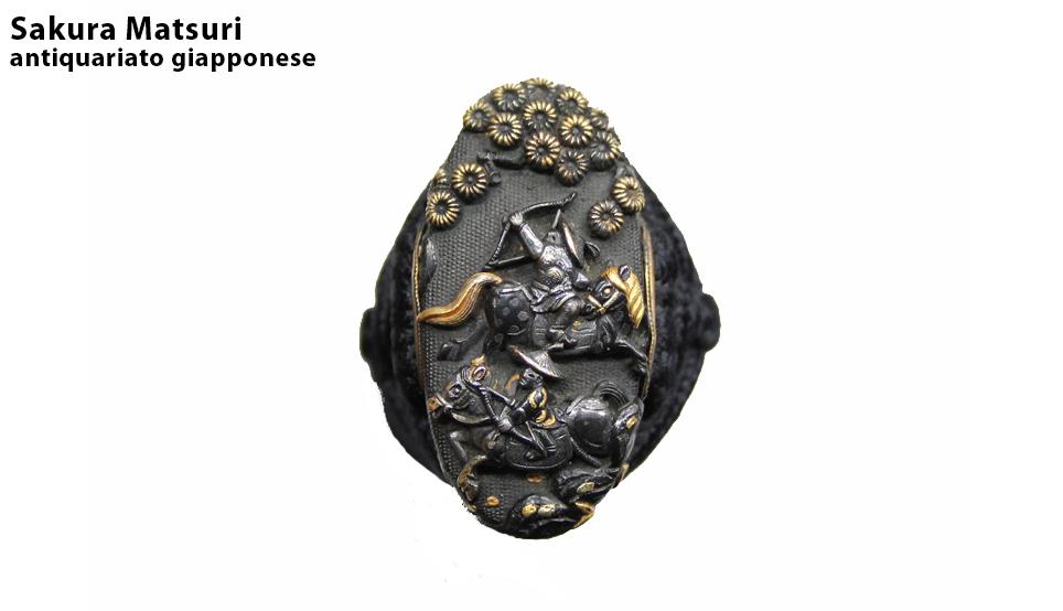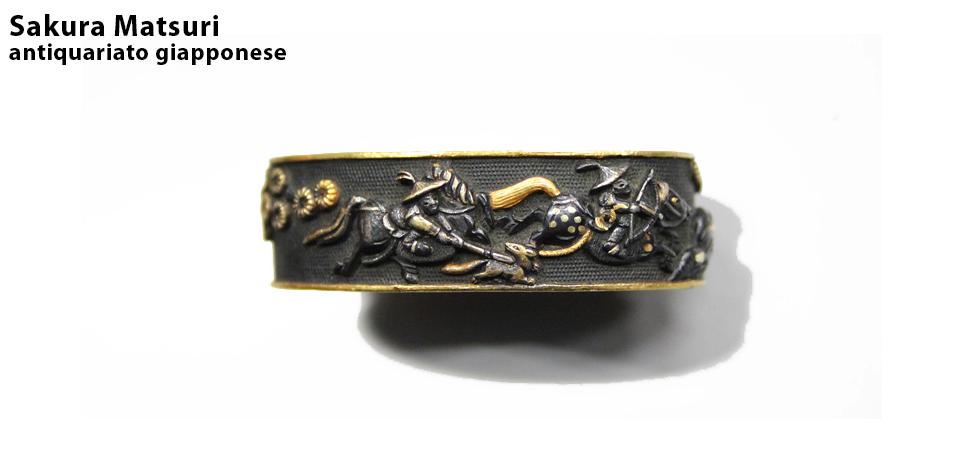 raffiguranti scene di caccia, menuki in shakudo a tema guerrieri in armatura
