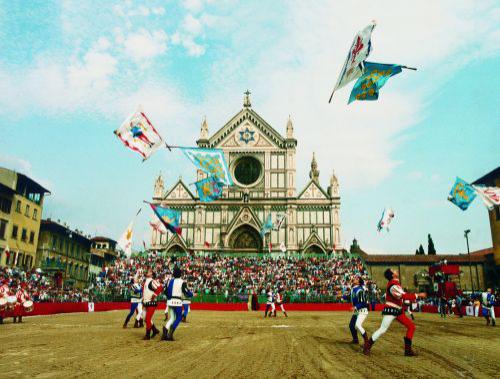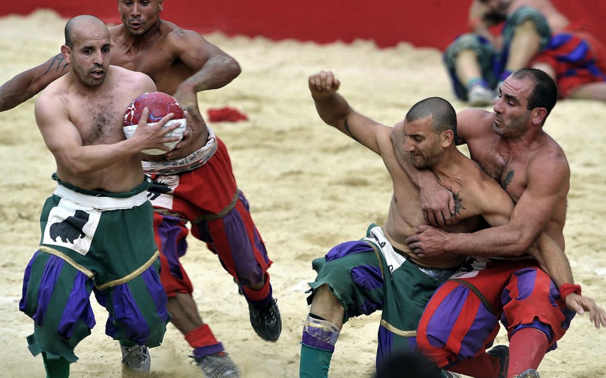 The game starts when the "Pallaio" kicks the ball in the field and the shot of "Colubrina" a little cannon, to salutare il gioco. At this time every player tries to catch the ball and put it in the opposite net to score a "Caccia" or point. At first the ball rests on field because the players fight in a wild boxing match against each other, the way is to knock out or pin down as many players possible, once there are enough incapacitated players, the other teammates come and swoop up the ball and head to the goal.
