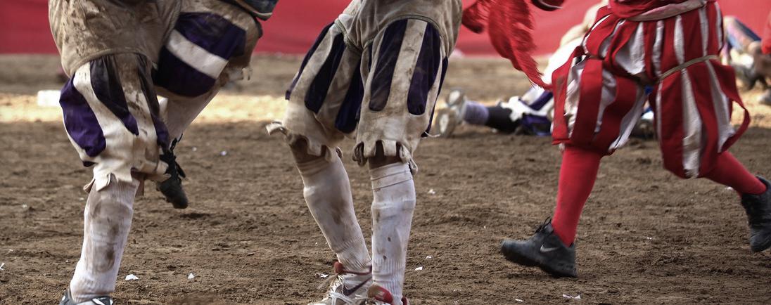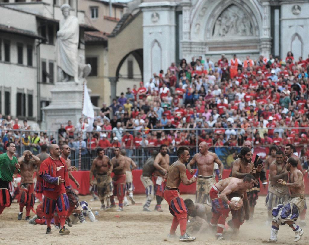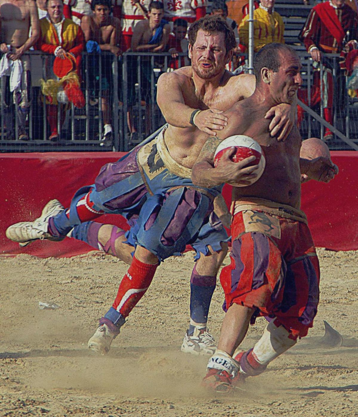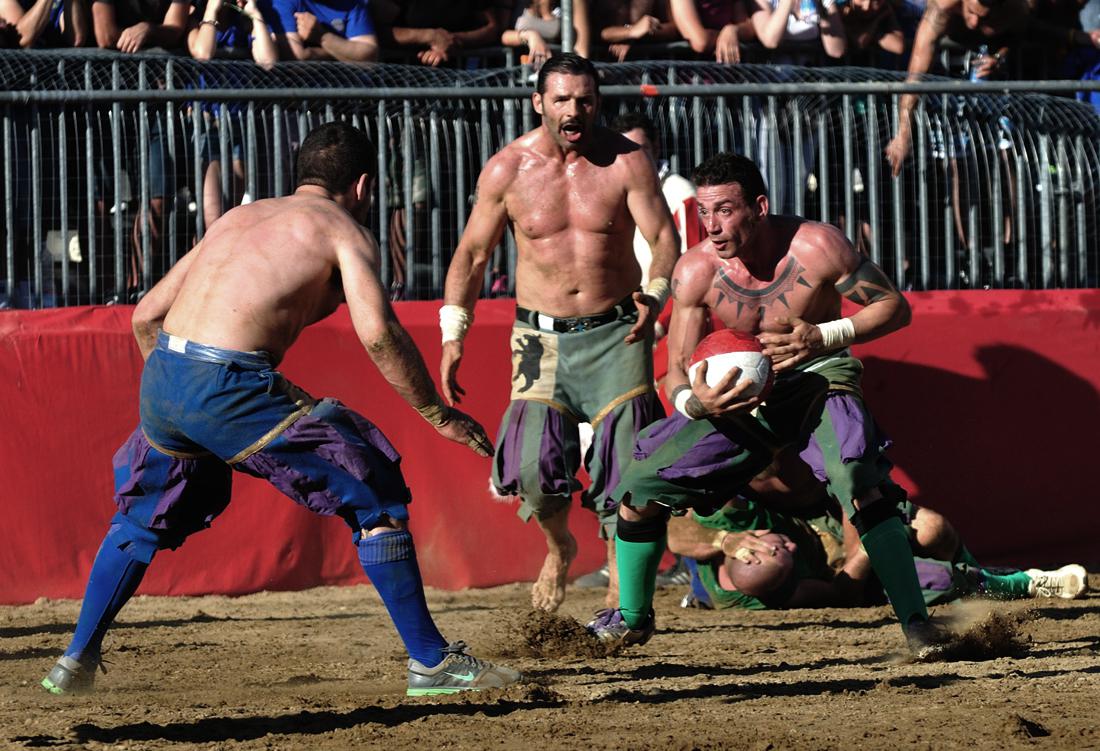 Matches last 50 minutes and are played on a field covered in sand, twice as long as it is wide. A white line divides the field into two identical squares, and a goal net runs the width of each end. Each team has 27 players with no substitutions. The teams are made up of four Datori indietro (goalkeepers), 3 Datori innanzi (fullbacks), 5 Sconciatori (halfbacks), 15 Innanzi o Corridori (forwards). The Captain and Standard Bearer's tent sits at the center of the goal net. They do not actively participate in the game, but can organize their teams and sometimes act as referees, mainly to calm down their players or to stop fights.