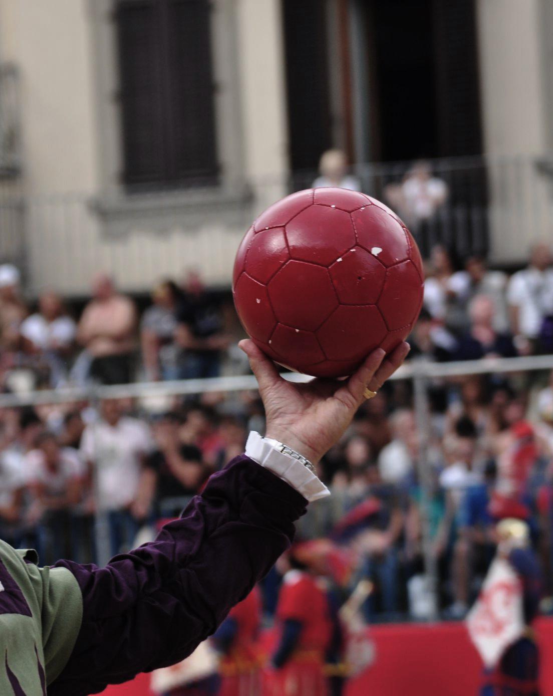 The game starts when the Pallaio throws the ball towards the center line, followed by a small cannon firing; the shot announces the beginning of the contest.