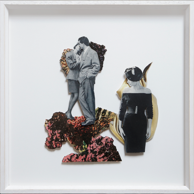 “I am visually intrigued by the past,” Belgiojoso writes. “I look for forgotten images and I take them back to the present…[my collages] tell the stories of inner worlds, thoughts and fantasies. They are my projections and interpretations of the other person, a metaphor for the work of the psychologist, where the unconscious minds meet to find a new form of expression.” Framed on a white background, her compositions appear to fly alone, the shadows they cast isolating them from the rest of the world.