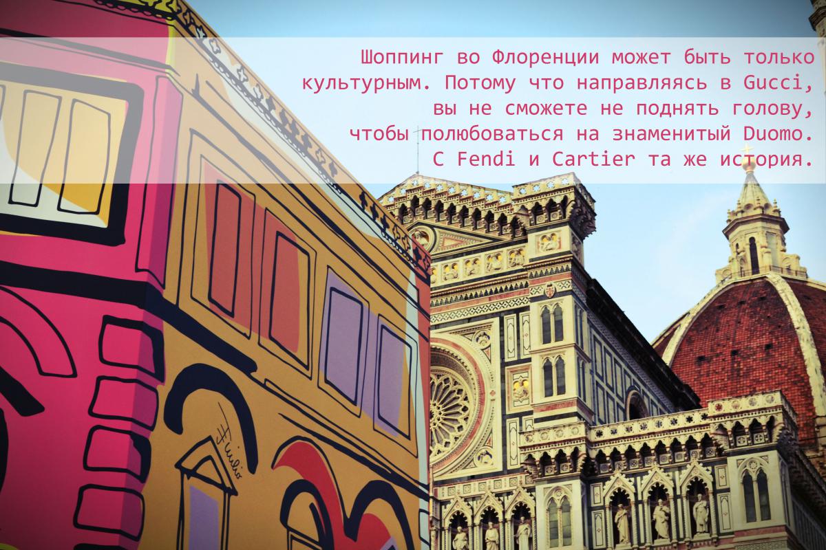 Шоппинг во Флоренции может быть только культурным. Потому что направляясь в Gucci, вы не сможете не поднять голову, чтобы полюбоваться на знаменитый Duomo. С Fendi и Cartier та же история.