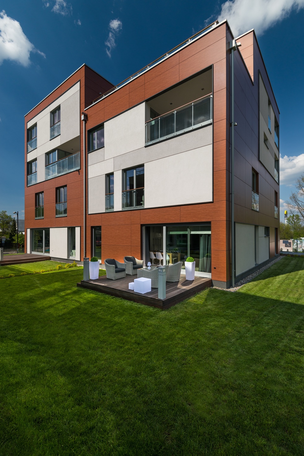 Mieszkania zaprojektowane są z dbałością o najdrobniejsze szczegóły i wykonane są z wysokiej jakości materiałów. Przemyślane rozwiązania użytkowe zapewnią mieszkańcom prawdziwy komfort codziennego życia. Duży nacisk położyliśmy szczególnie na reprezentacyjny charakter części wspólnych. Estetyczne wykończenie elewacji domu płytami hpl funermax, cokołów budynku i stopni schodowych granitem Absolut Black, zastosowanie panoramicznych wind firmy KONE , drewnianych tarasów z drewna bangkirai oraz podłóg w holach wejściowych z Gresu Traventino i wysokiej jakości wykładziny – wszystko po to, by zaspokoić potrzeby i gust najbardziej wymagających klientów.