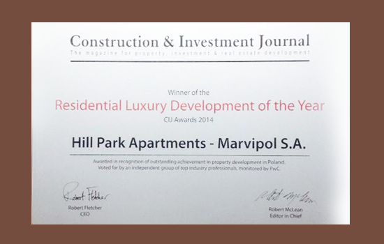 Hill Park Apartments został wyróżniony w 12 edycji prestiżowego konkursu, organizowanego przez CIJ Awards - miesięcznik poświęcony branży deweloperskiej w Europie Środkowo-Wschodniej. Nagroda została przyznaną inwestycji w kategorii Residential Luxury Development of the Year, jako potwierdzenie najwyższego standardu wykończenia.