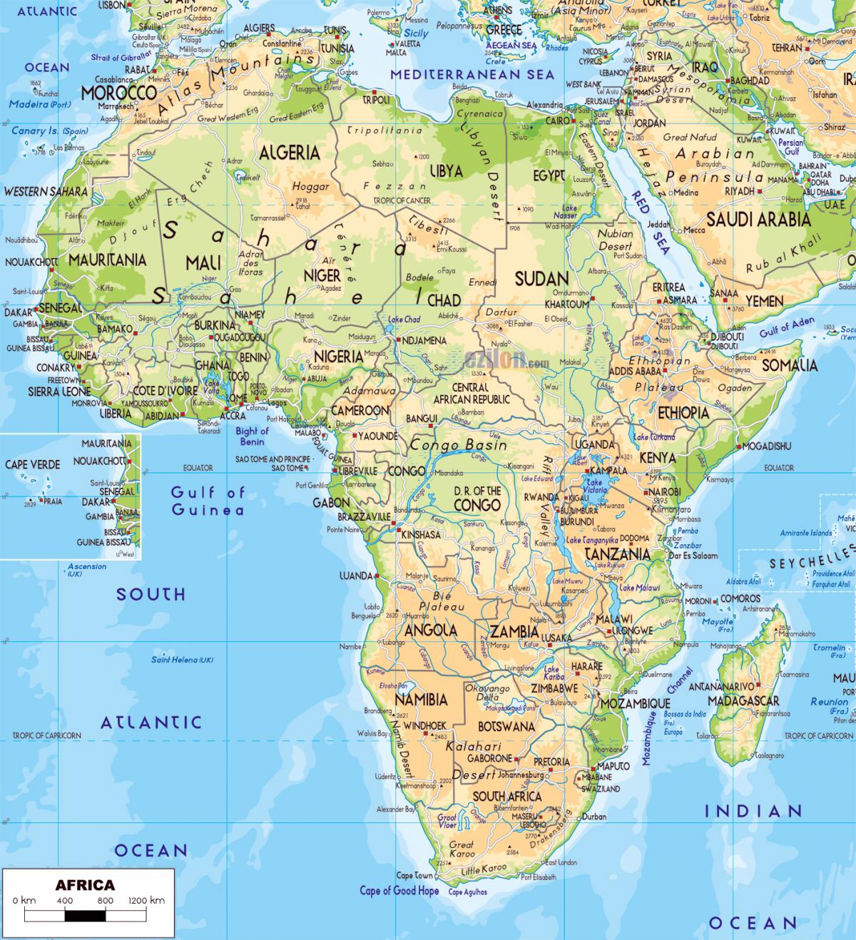 sateliittikuvassa erottuvat Afrikan sademetsät tummanvihreinä alueina. Sademetsää ympäröivät vaaleamman vihreät alueet jotka ovat savannia. Aavikot erottuvat vaaleanruskeina alueina. Afrikan pohjoisosassa on iso Saharan autiomaa. Rannikon vesi on vihertävää. Se osoittaa, että rannikon matalassa vedessä on levää kalojen ruuaksi.
